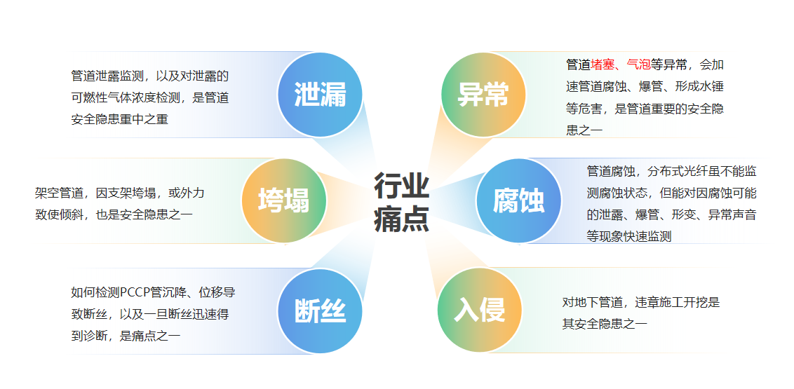 管道產生堵塞、氣泡等異常(會發生爆管、水錘等災害),通常會伴隨振動、聲音、溫度等變化,分布式光纖對其參數變化而預警
